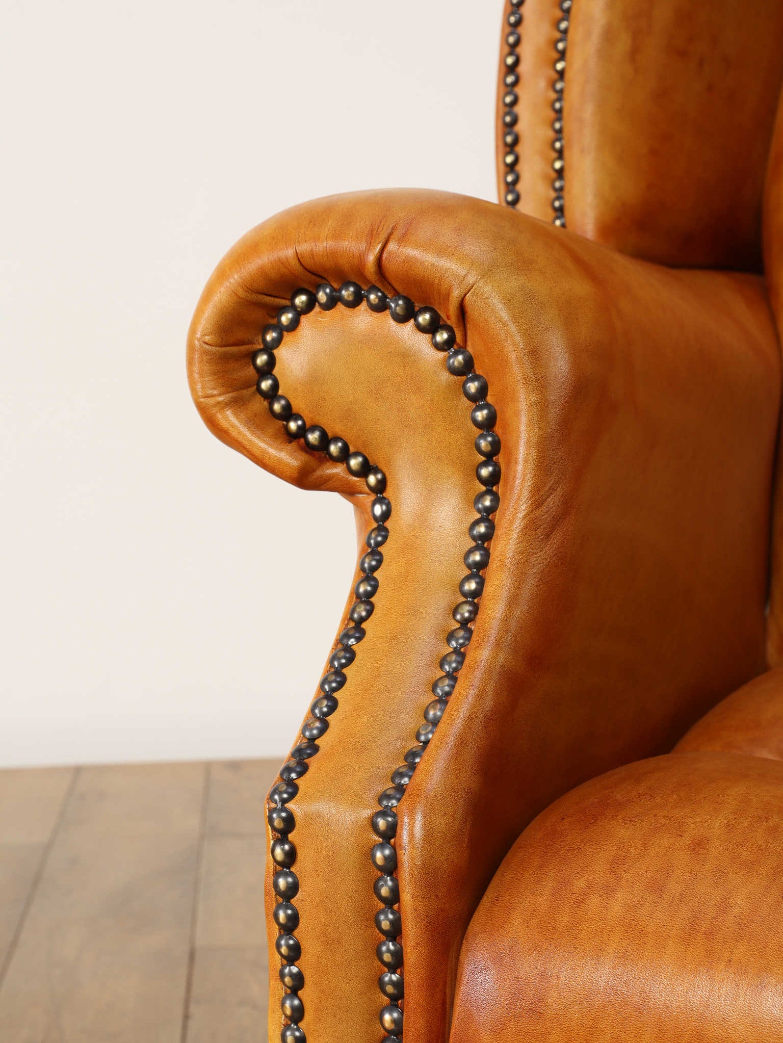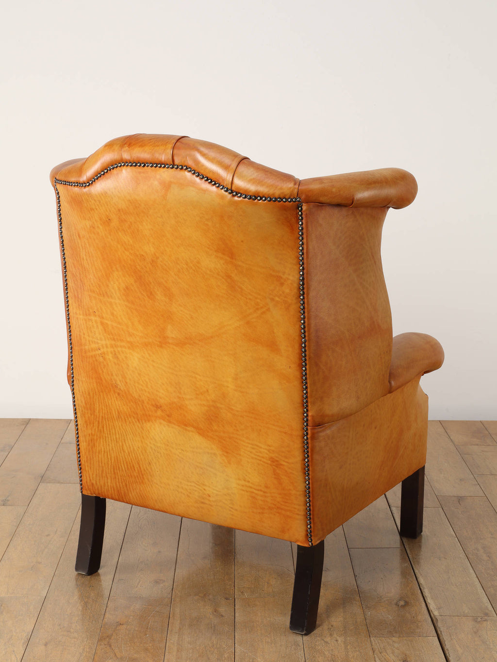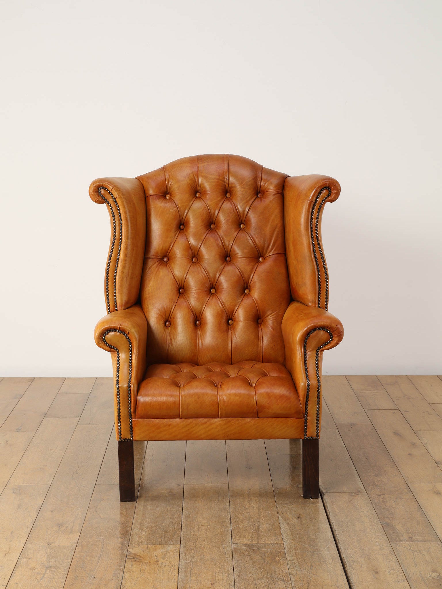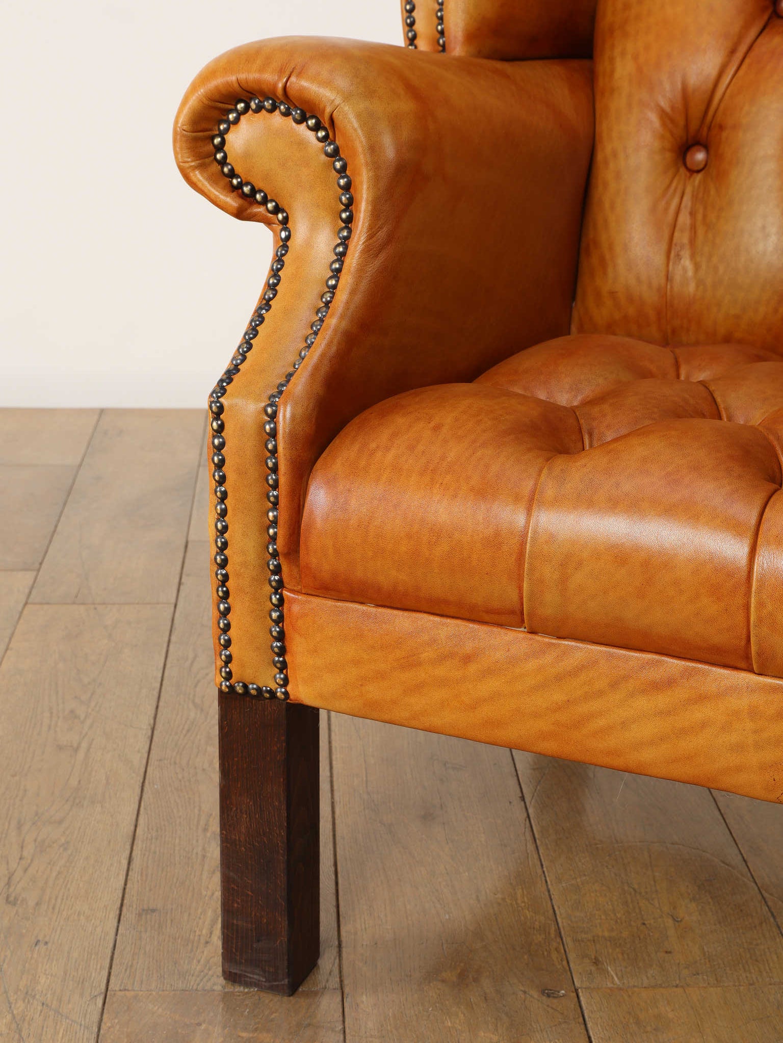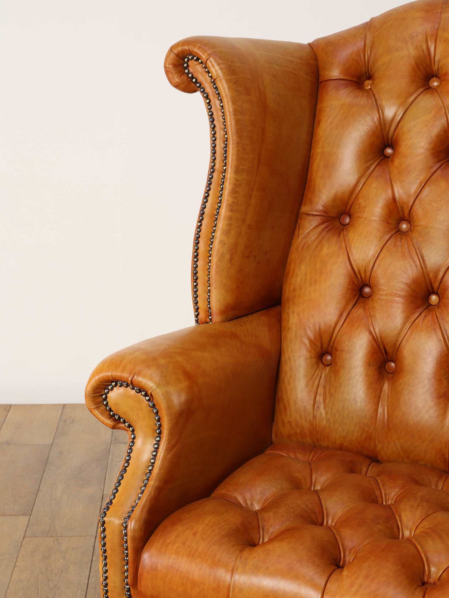 重厚感と気品あふれるデザインから、イギリスにおいて伝統的なジェントルマンズスタイルの象徴的なアイコンとして認知されているウイングチェア。暖炉のそばで紳士たちが座していた頃からの歴史を持つ、格式高いウィングバックスタイルです。頭部までしっかりと支え、座る人を優雅に包み込みます。こちらの商品は1970年頃のヴィンテージの個体を現地英国のクラフトマンが素材選びから選定し、鍛錬に仕上げたヴィンテージフレーム、ニューレザーの本物の1品です。垢のブナ材を使用した堅牢なフレームに、経年変化をイメージしながら、本革を選定しました。背面、シート部のボタン締めは圧巻であり、熟練職人による手作業の証が伺えます。タイムレスな魅力を持つこの商品は、伝統的なインテリアはもちろんのこと、モダンな現代シーンにも素晴らしいコントラストを生み出すでしょう。カラーはマスタードになります。※ハンドダイレザー仕上げの特性上、強くこすると色が落ち、色移りする可能性があります。