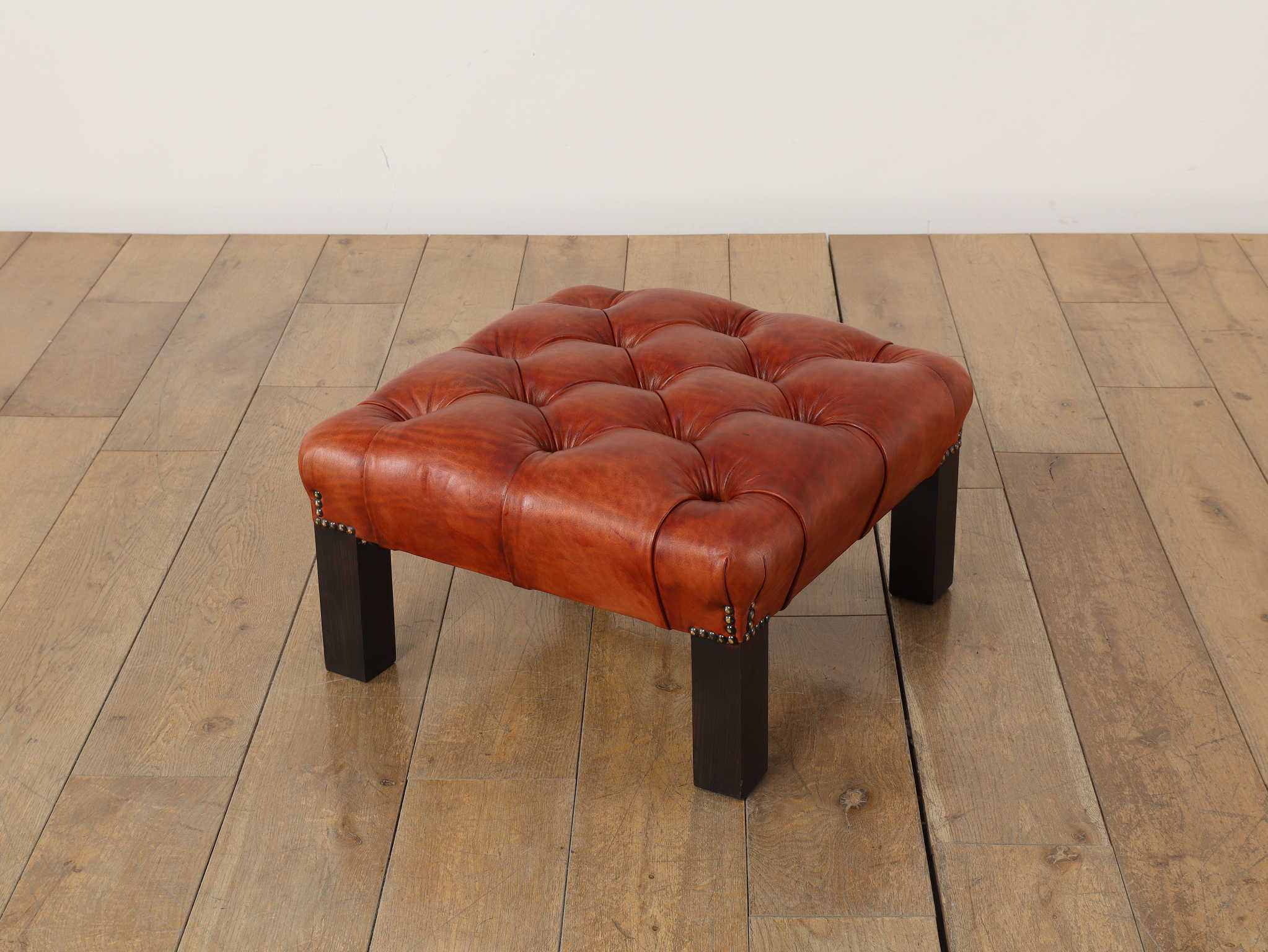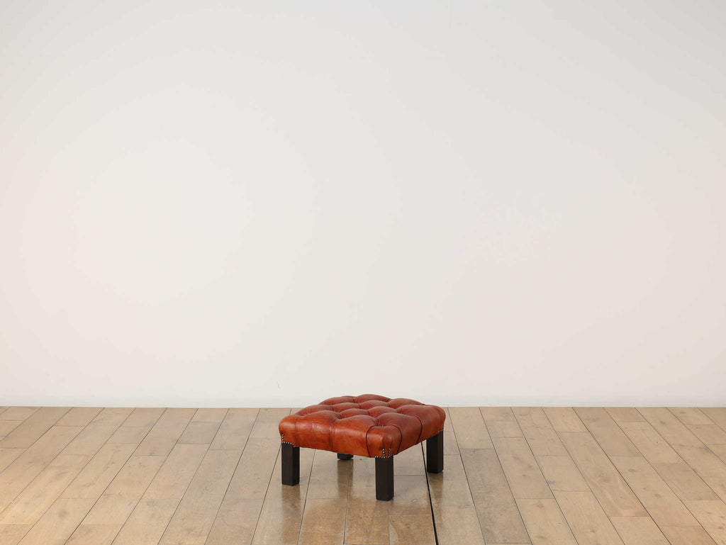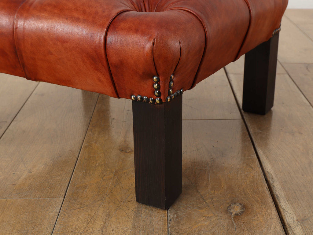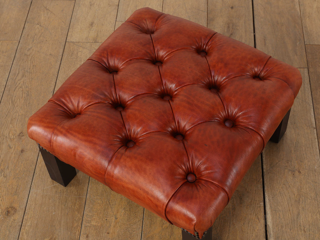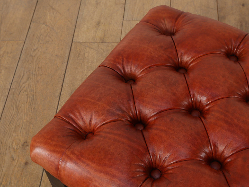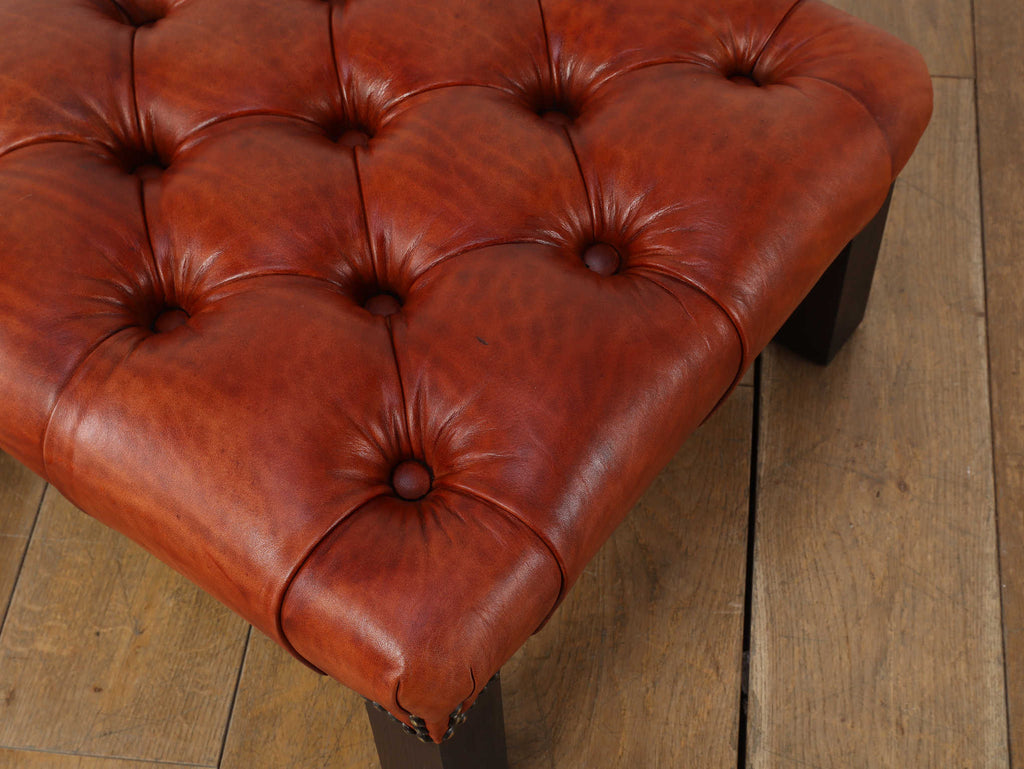 重厚感と気品あふれるデザインから、イギリスにおいて伝統的なジェントルマンズスタイルの象徴的なアイコンとして認知されているボタンシートのレザーチェア。こちらはフットスールですが、単体としても存在感を放ち、クラシックなインテリアアイテムとして重宝することでしょう。垢のブナ材を使用した堅牢なフレームに、経年変化をイメージしながら、本革を選定しました。シート部のボタン締めは圧巻であり、熟練職人による手作業の証が伺えます。タイムレスな魅力を持つこの商品は、伝統的なインテリアはもちろんのこと、モダンな現代シーンにも素晴らしいコントラストを生み出すでしょう。カラーはコニャックになります。※ハンドダイレザー仕上げの特性上、強くこすると色が落ち、色移りする可能性があります。