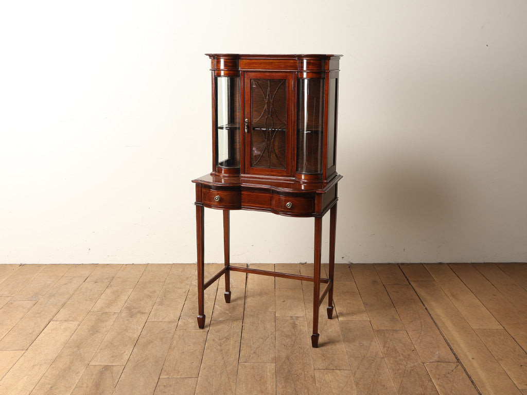 1900年代にイギリスで製造されたと推定される、マホガニー材のエドウォーディアンディスプレイキャビネットです。このお品物の最大の魅力は、エドウォーディアン様式ならではの華奢なシルエットと、上品でシンプルな装飾性にあります。すらりとした脚部やサイドの美しい曲面ガラス、扉に施された繊細な格子装飾など、随所に職人のこだわった造りの細部が光ります。マホガニー材の深い艶が、中に飾る大切なコレクションをより一層引き立ててくれることでしょう。W620mm、H1265mmという、圧迫感を与えず現代の日本の住環境でも大変使いやすいサイズ感も魅力です。リビングや寝室、玄関など、どこに置いても華になるデザイン性を備えた、ご自宅の空間をクラスアップしてくれる上質な逸品です。