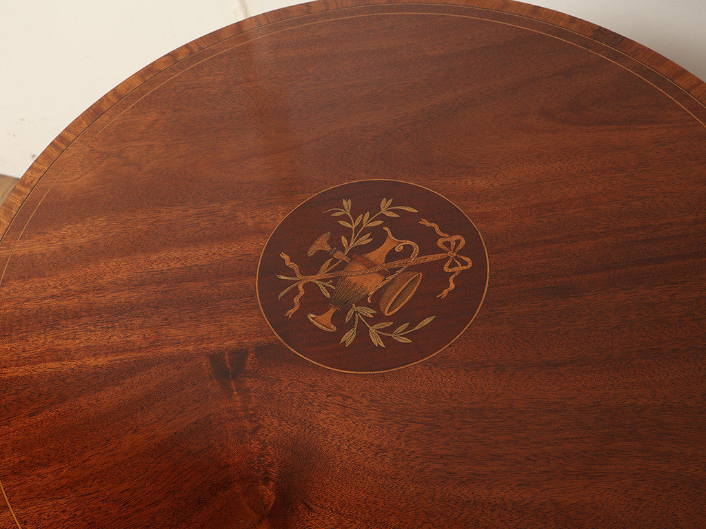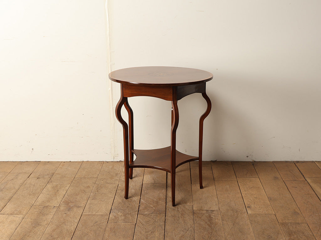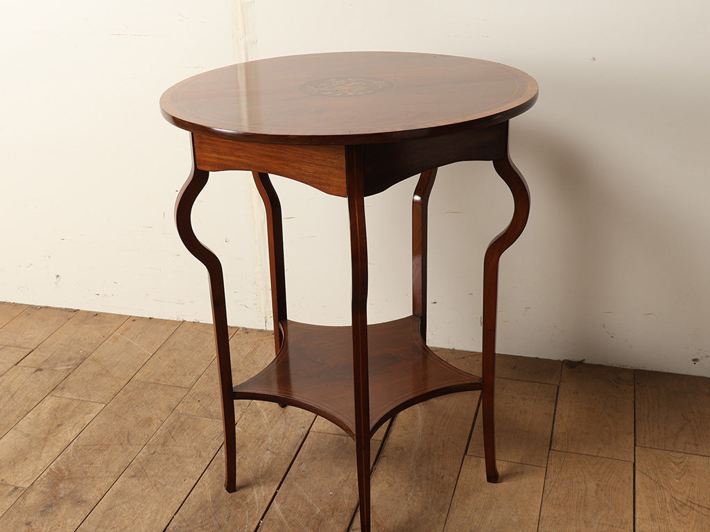 こちらは1900年代頃、イギリスで製造されたと推定される色々な用途で使えるオケージョンテーブルです。約120年経過した経年変化による味わい深いマホガニーが使用され、その滑らかな質感と深い色艶が空間に格別の品格をもたらします。最大の魅力は、天板中央に施された極めて緻密なインレイ(象嵌)細工です。異なる色味の木材を組み合わせ、楽器や植物のモチーフを鮮やかに描き出すこの技法は、当時の職人の高い熟練度を物語っています。また、優雅な曲線を描く脚部(カブリオールレッグ)や、実用的な下段の棚板など、どこから見ても隙のない美しさを備えています。ティーテーブルとしてはもちろん、花瓶を飾るサイドテーブルとしても、お部屋の印象を華やかに引き立ててくれるでしょう。