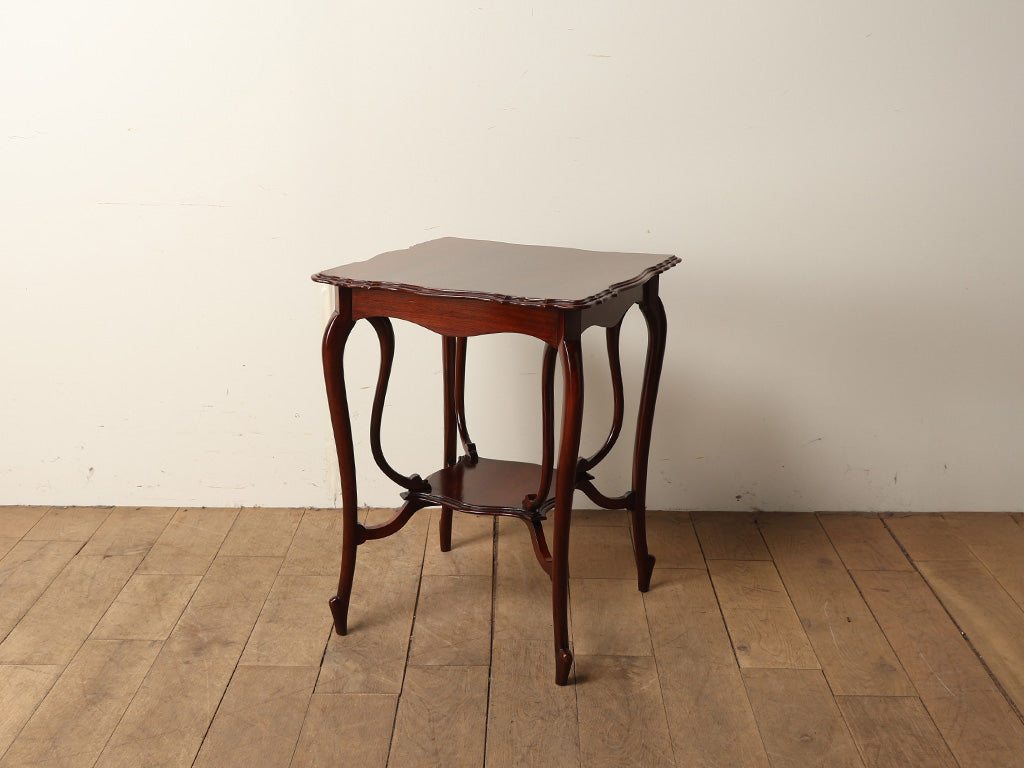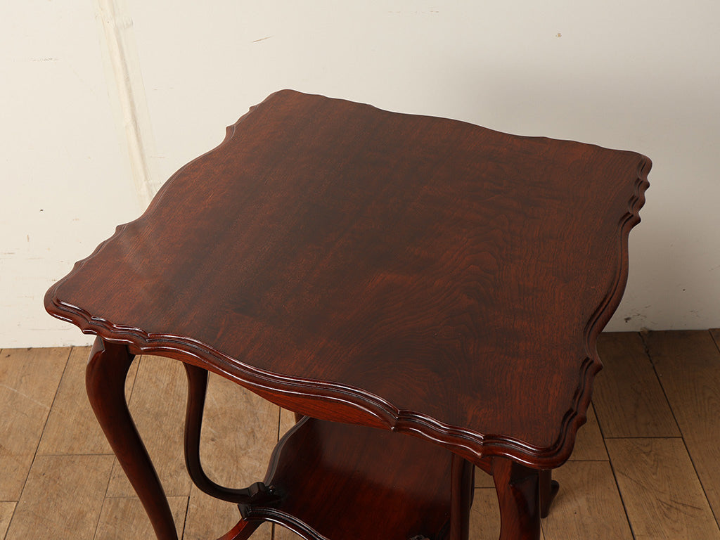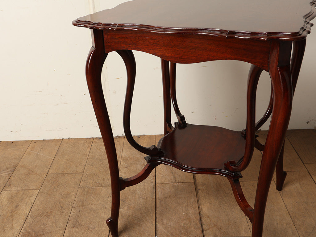 素材にはマホガニー材を贅沢に使用。天板に見られる繊細な木目と、長い年月を経て深みを増した艶やかな琥珀色が、極上の気品を醸し出しています。最大の魅力は、アールヌーヴォー様式特有の流れるような脚部の造形です。細くしなやかに伸びる脚が、下段の棚板へと美しく繋がるシルエットは、まるで一つの芸術品のよう。また、天板の縁に施された波打つようなカッティングも、職人の高い美意識を感じさせます。ティーテーブルとして、あるいはお気に入りのランプや花瓶を飾るサイドテーブルとしておすすめです。
