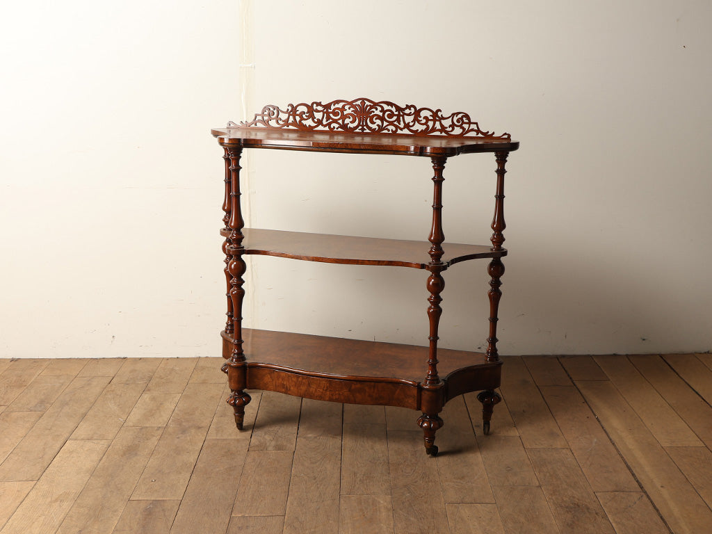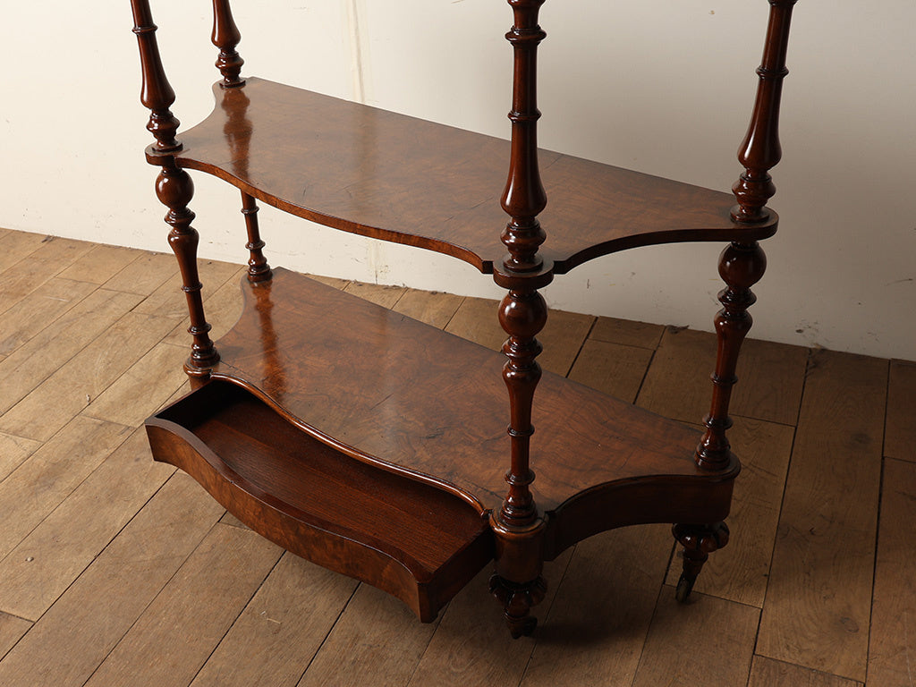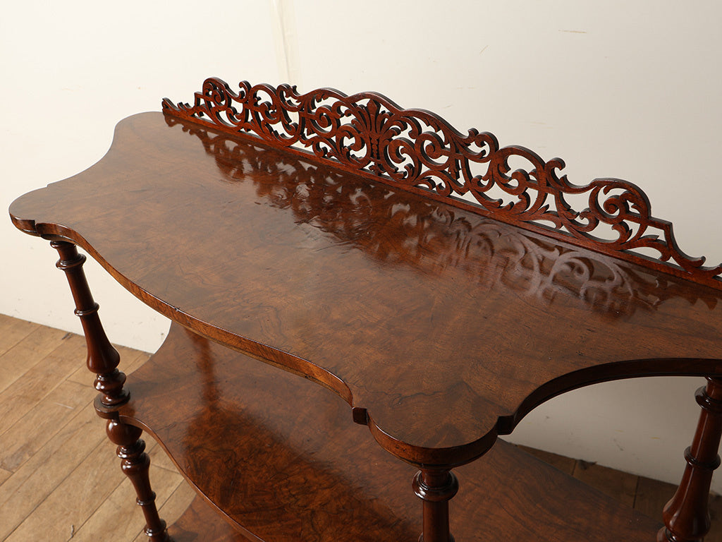 ヴィクトリアン・アンティークの華やかさを象徴する、ウォルナット材のディスプレイシェルフ。天板後方には繊細な透かし彫りが施され、空間に優美なリズムを生み出しています。三段の棚板は、それぞれが緩やかな曲線を描くサーペンタイン形状に仕上げられ、支柱には贅沢な挽き物細工が施されています。最下段には、前板に美しい杢目を持たせた抽斗も備わっており、機能性も兼備。リビングのコーナーを彩る飾り棚として、あるいは書斎のパーソナルな収納として、現代の暮らしに華を添えてくれる一台です。