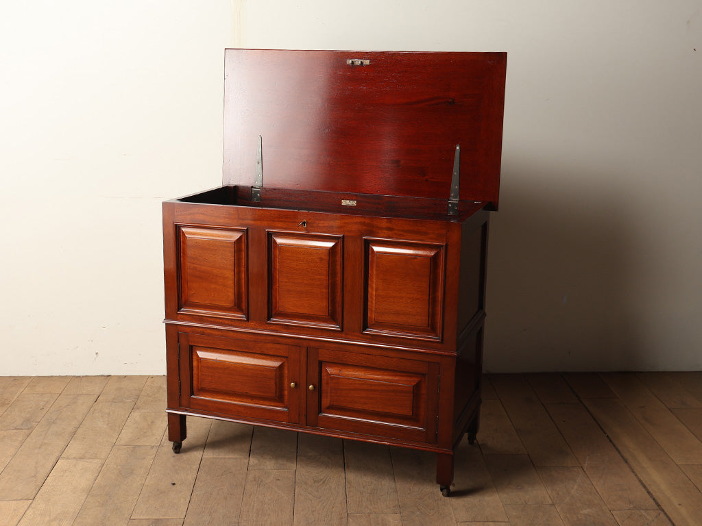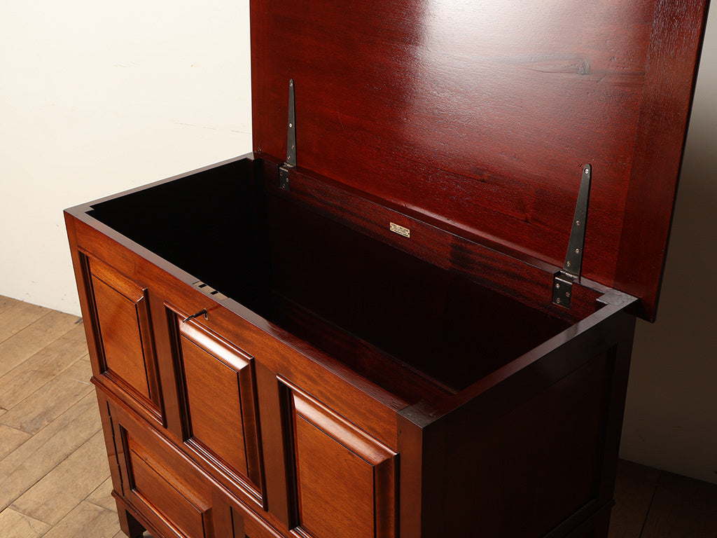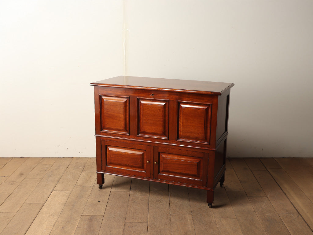 イギリスの「SYDNEY J. WHITEHEAD」社によって製作された、気品あふれるマホガニー材のミュールチェスト。上部の蓋を開けて使う大きなボックス収納と、下段の扉付き収納という2つの異なる機能を一つにまとめたユニークな構造が特徴で、ブランケットボックスから現代的なチェストへと進化する過程の形と言われています。前面に施された立体的なパネル装飾が、赤みを帯びたマホガニーの美しい光沢をより一層引き立てています。リビングや寝室の主役として、空間に格式高い落ち着きをもたらしてくれます。