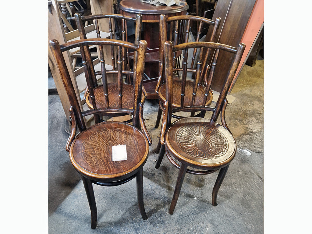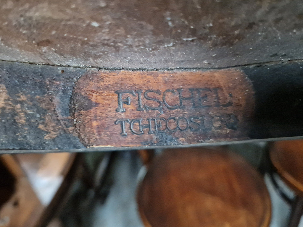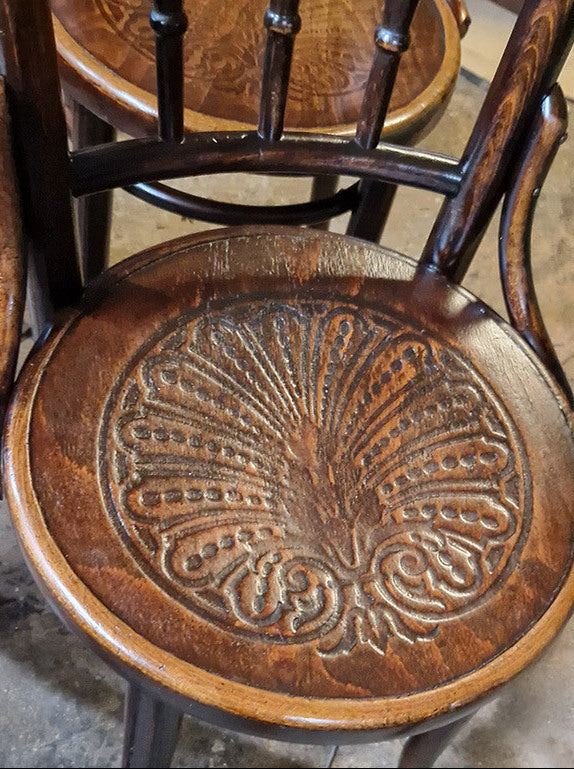 1920年代(推定)、FISCHEL社によって作られた美しい曲木(ベントウッド)のダイニングチェアです。ビーチ材を蒸して曲げる独自の技法によるしなやかなラインと背もたれに施された「バンブー(竹)」を模した装飾的な支柱が、クラシカルな中にも軽やかな気品を漂わせます。約100年の歳月を経て深みを増した飴色の木肌は、現代のリビングやダイニングに置くだけで物語を感じさせる温かな風景を創り出してくれるでしょう。座面に施された繊細なプレス加工のデザインは、芸術品のような趣があり、英国ヴィンテージなどの木製家具とも非常に相性が良い一品です。