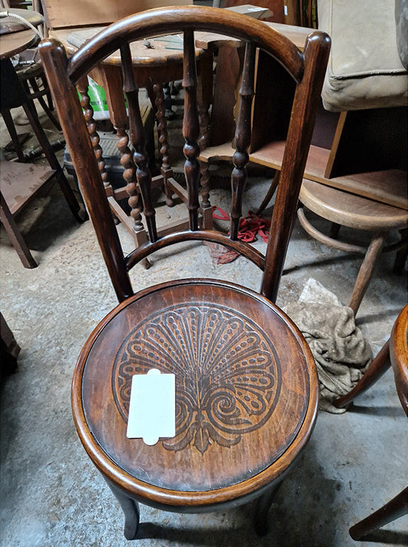 1920年代(推定)、曲木家具の黄金期にポーランドで製造された稀少なベントウッドチェアです。約100年という長い歳月を重ねて育まれたビーチ材の木肌は、アンティーク特有の深くしっとりとした味わいを放っています。背もたれの支柱に施された「バンブー(竹)」を模した装飾は、東洋的なエキゾチズムと西欧の洗練が融合した当時の流行を物語り、空間に軽やかな気品を添えてくれます。