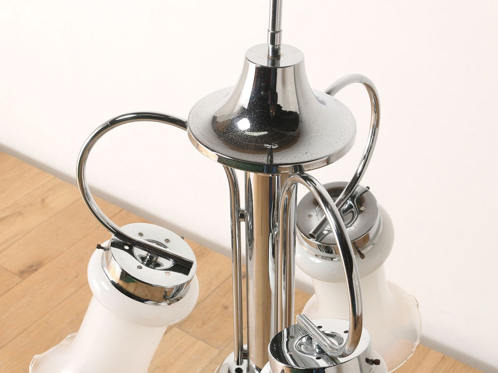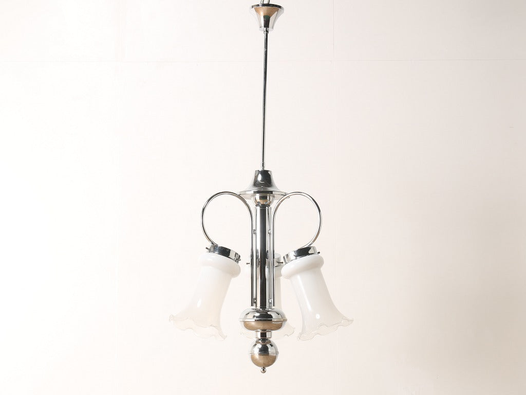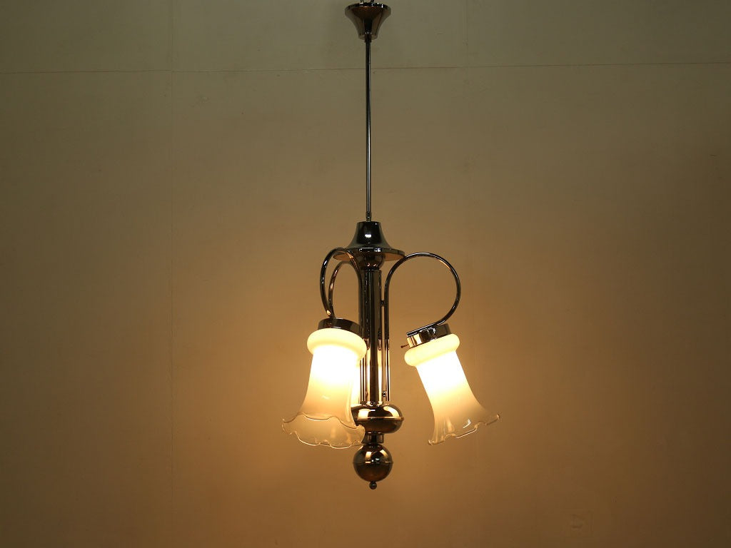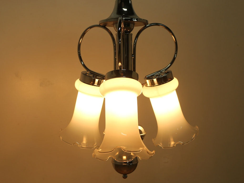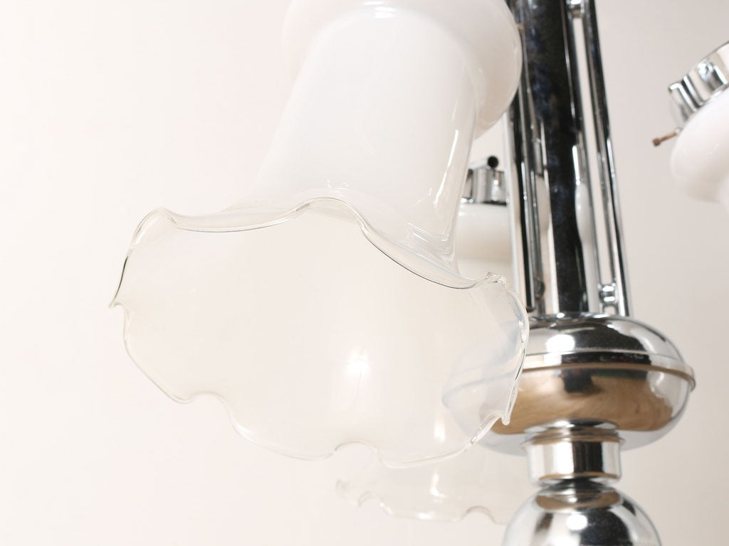 ボリュームのあるサイズが印象的なシーリングランプ。クロム材のフレームにつぼみが開いたようなガラスシェードを合わせ、クールでありながら可憐なイメージを併せ持ったデザインです。乳白色な色合いから透明度を上げたグラデーションになっており、灯りをつけている時でも消している時でも目を奪われるシーリングランプです。大振りなサイズの為、低いサイズの家具と合わせたり、シンプルな空間の中で、活躍するでしょう。
