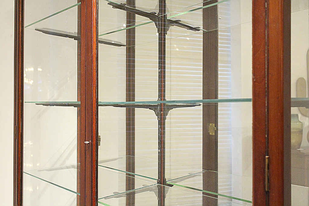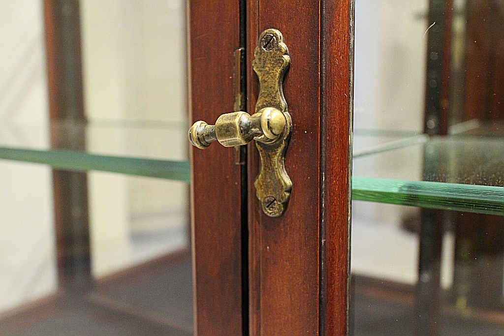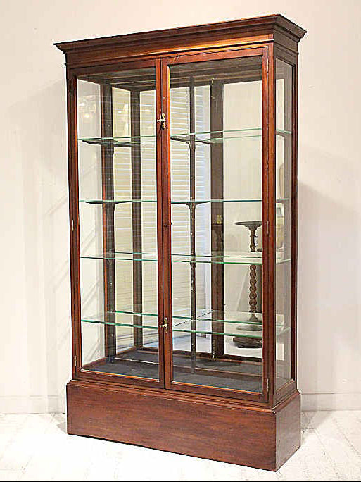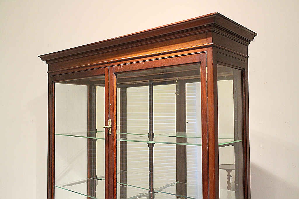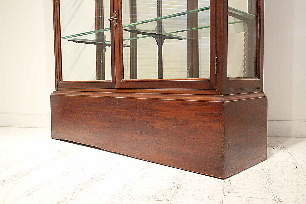 推定1880年代頃のイギリスにて製造されたこちらのショップキャビネット。荘厳な存在感を感じさせるこちらのアイテムは、W1270 D400 H2130 というサイズ設計で、ショーケースとしての収納力は十分だと言えるでしょう。H2130という迫力を楽しんで頂くと同時にD400と奥行きは浅く圧迫感を抑えたデザインであることもポイントです。また背板にはミラーになっており、クリアガラスの透明感を邪魔することなく、ディスプレイして頂くものをより立体的jに反射させてくれます。マホガニーの木フレームがクラシカルな輪郭を与え、当時の格式高い雰囲気がさらに飾るアイテムに優雅さを添えてくれるでしょう。