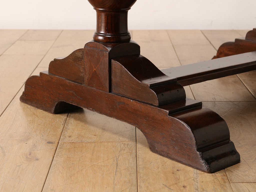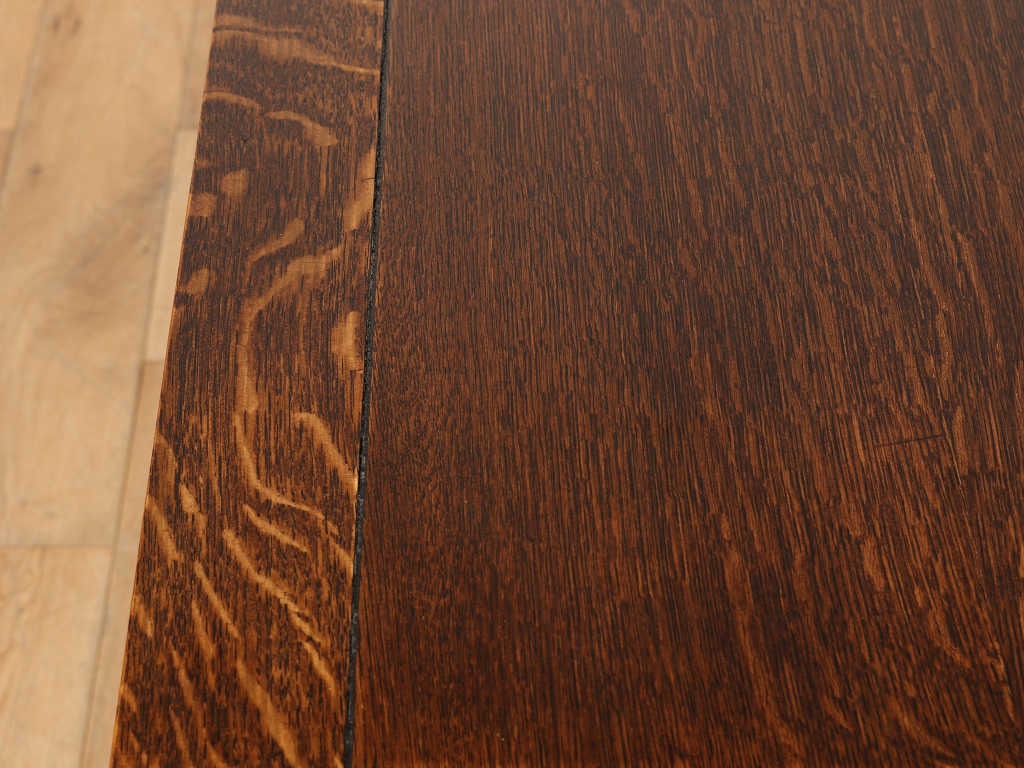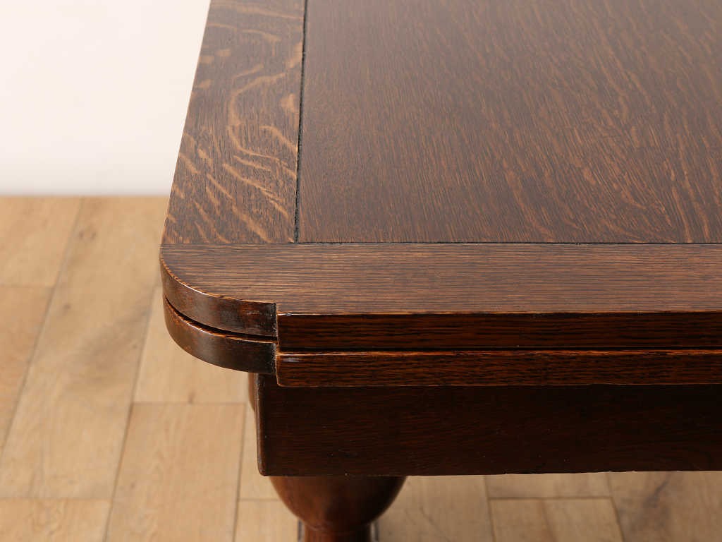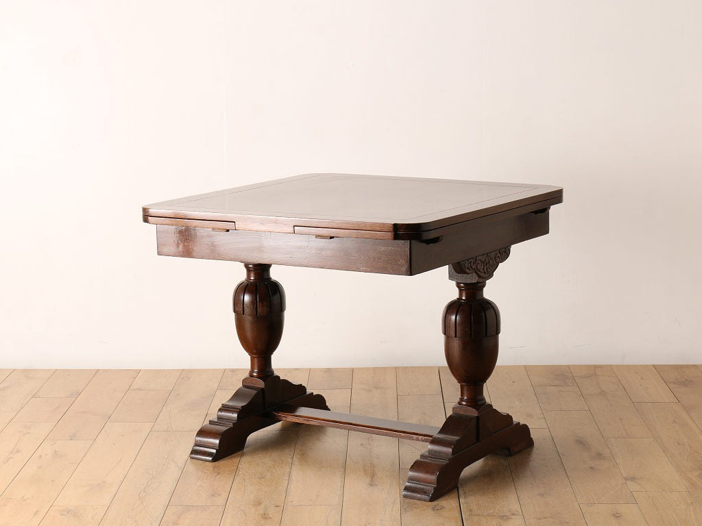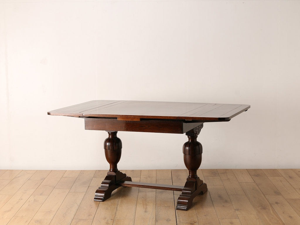 16世紀頃、イギリスで誕生したと言われているドローリーフテーブル。その名の通り、天板下に備えられたサブ天板を広げる事で天板の大きさを変える事の出来るものです。この一台の様におよそ900*900の正方形でつくられたものが一般的で、主に杢目や脚部のデザインに個性が出ます。天板に見られる溝は、無垢材に特有の湿気や乾燥による膨張を見越した「あそび」であり、長い年月使用する事が前提となっています。日々の生活が味わいとなって天板に現れるため、使う程に愛着が湧くこと請け合いのアイテムでしょう。
