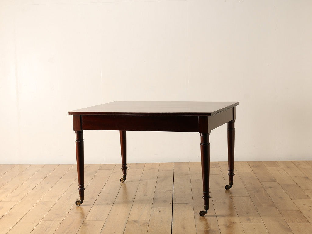 ヴィクトリアン時代中期、約150年前と非常に古く、質感が抜群なテーブルです。天板のマホガニーは一枚板が使われており、時代を生きたパティーナ(経年艶)が程よく感じられます。デザインは非常にシンプルですが、シンプルが故にアンティークテーブルの風合いがよく、オリジナルの真鍮キャスター含め独特の存在感が魅力です。