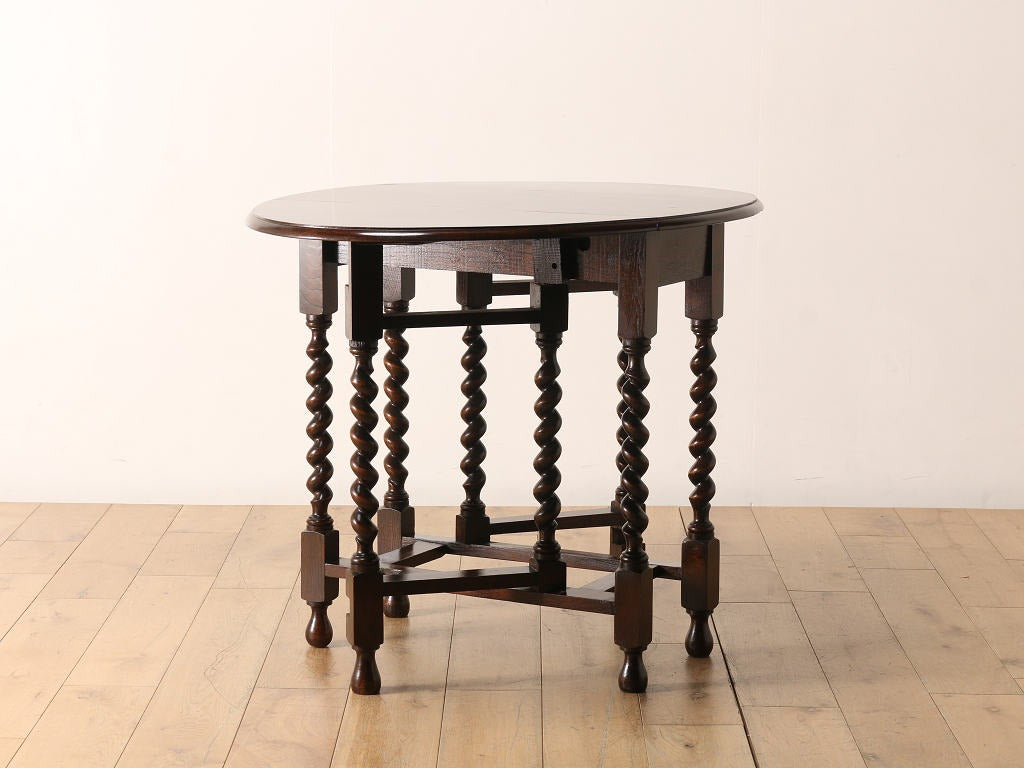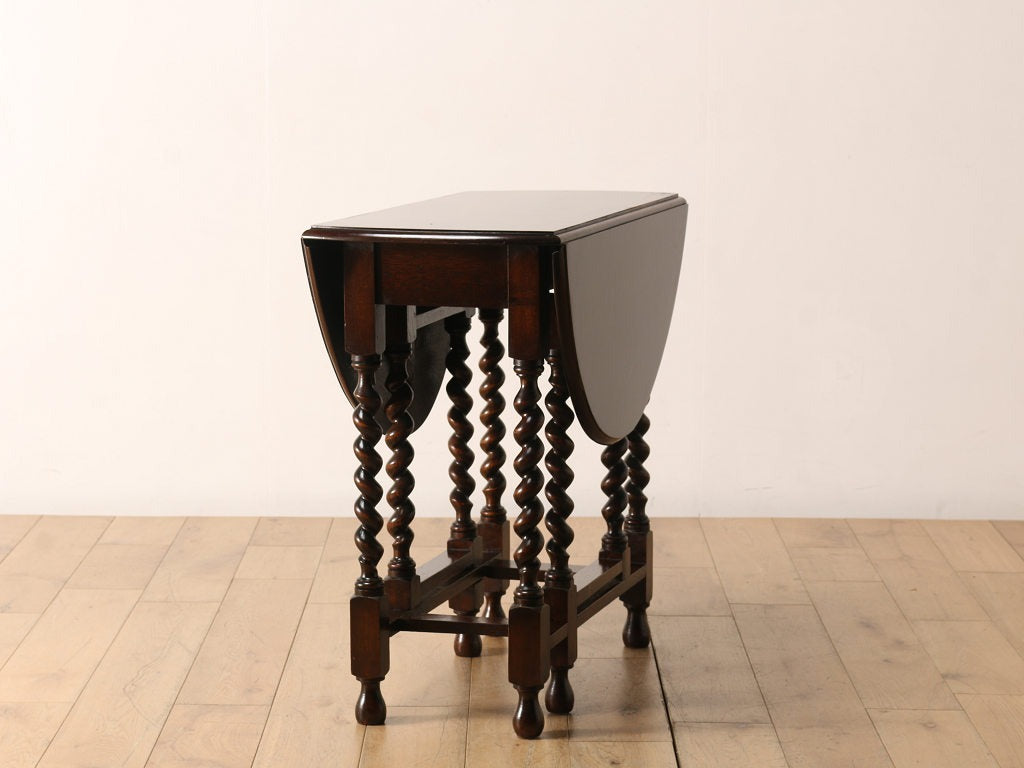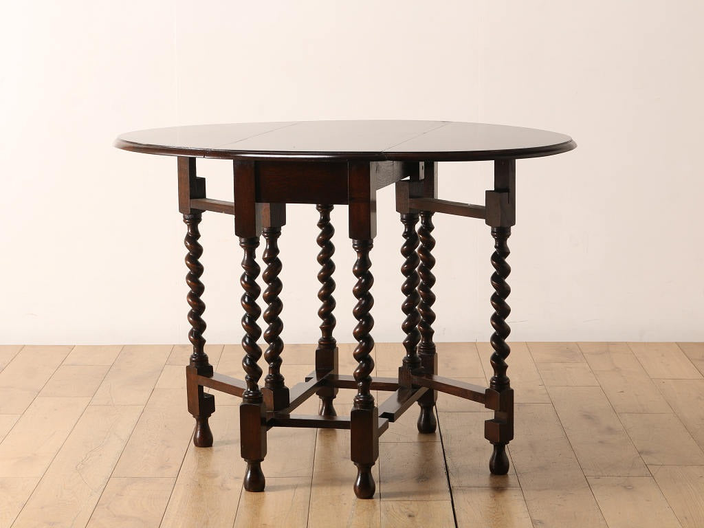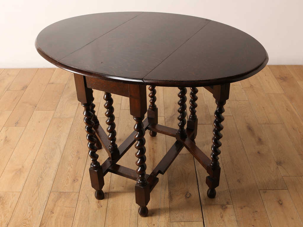 両サイドに折り畳み可能な天板が付いているバタフライ式のテーブルです。天板の支えになる可動式の脚部が、開閉式の「門」を思わせる動きをすることからその名が付きました。使用する場所、スペースに合わせて、サイズを変えられるため、当時からとても重宝されており、アンティーク家具の中でも定番のテーブルです。その分、大きさやデザインは実に様々で、ご自分だけの逸品を探す楽しさもあります。長く愛される定番の魅力を、生活の中に取り入れてみてはいかがでしょうか。