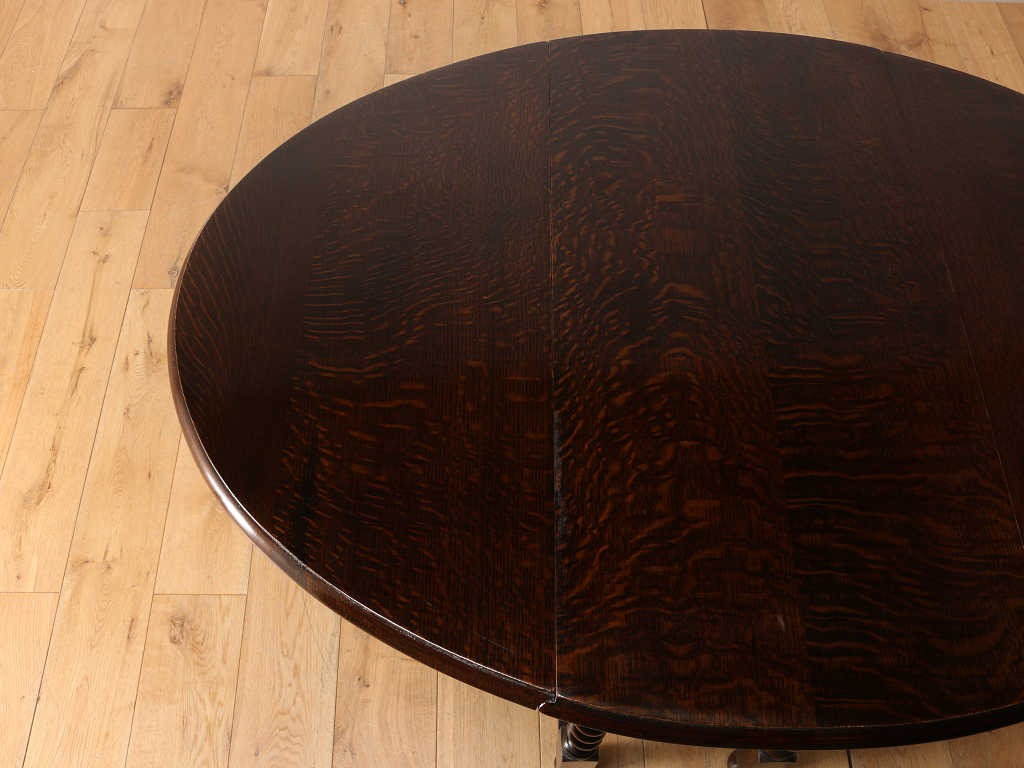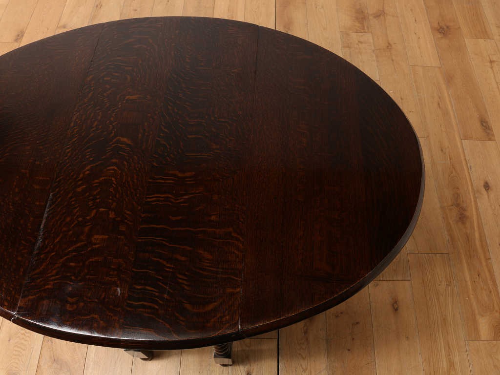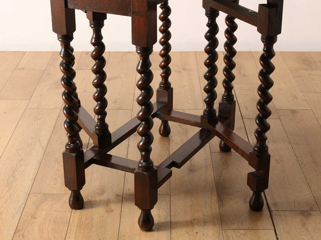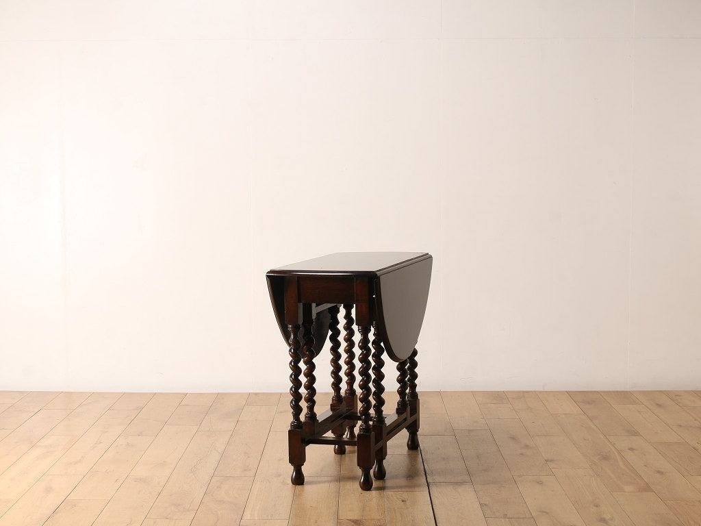 両サイドに折り畳み可能な天板が付いているバタフライ式のテーブルです。天板の支えになる可動式の脚部が、開閉式の「門」を思わせる動きをすることからその名が付きました。使用する場所、スペースに合わせて、サイズを変えられるため、当時からとても重宝されており、アンティーク家具の中でも定番のテーブルです。その分、大きさやデザインは実に様々で、ご自分だけの逸品を探す楽しさもあります。長く愛される定番の魅力を、生活の中に取り入れてみてはいかがでしょうか。