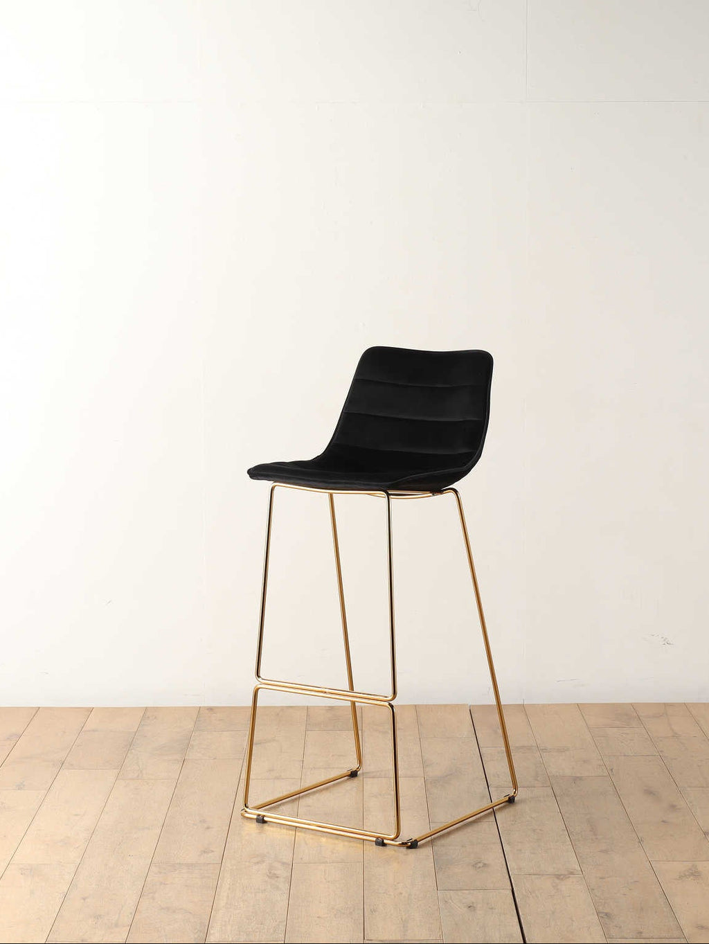 カウンターなどにあわせてお使いいただくハイスツールです。背もたれがあることで座ったときの体の安定感を感じていただけます。座面のブラックと脚部のゴールドの組み合わせがモダンな印象を与えてくれます。ベルベットの張地は手触りもよく重宝しそうなアイテムです。